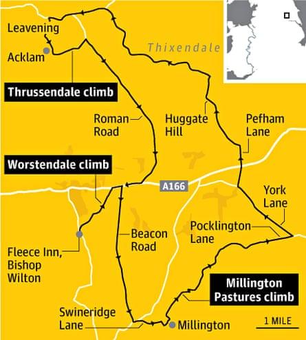 Si vous êtes à York pour le Tour, dirigez-vous vers l'est et allez voir Worstendale, un bijou de montée qui commence à Bishop Wilton, souvent célébré comme le plus joli village du Yorkshire de l'Est. Retournez à Millington (bon café) et prenez la route Huggate jusqu'à Millington Pastures (80 m en 2,6 km, bit.ly/1iMbptp), une belle montée douce avec un petit coup de fouet à la fin. Les habitués savent qu'au sommet de cette montée, une forte attraction gravitationnelle commence, vous entraînant vers le Seaways Cafe(seawayscafefridaythorpe.co.uk) à Fridaythorpe, un joyau sans prétention et un havre de paix par mauvais temps. Lorsque les nuages s'éclaircissent, allez voir Thixendale (94 m en 4 km, bit.ly/1ilQ0Lfa), un vallon étroit et sinueux qui s'élève pour offrir une vue magnifique sur les North York Moors. De là, descendez à Acklam et respirez profondément pour le dernier casse-pieds, Thrussendale (128 m en 0,9 km, bit.ly/1epBvqm). La route commence, de manière inquiétante, par un petit cimetière, puis monte en flèche jusqu'au mât de la radio. Depuis le bas, on a l'impression réconfortante qu'il y aura un répit à mi-chemin. Il n'en est rien.